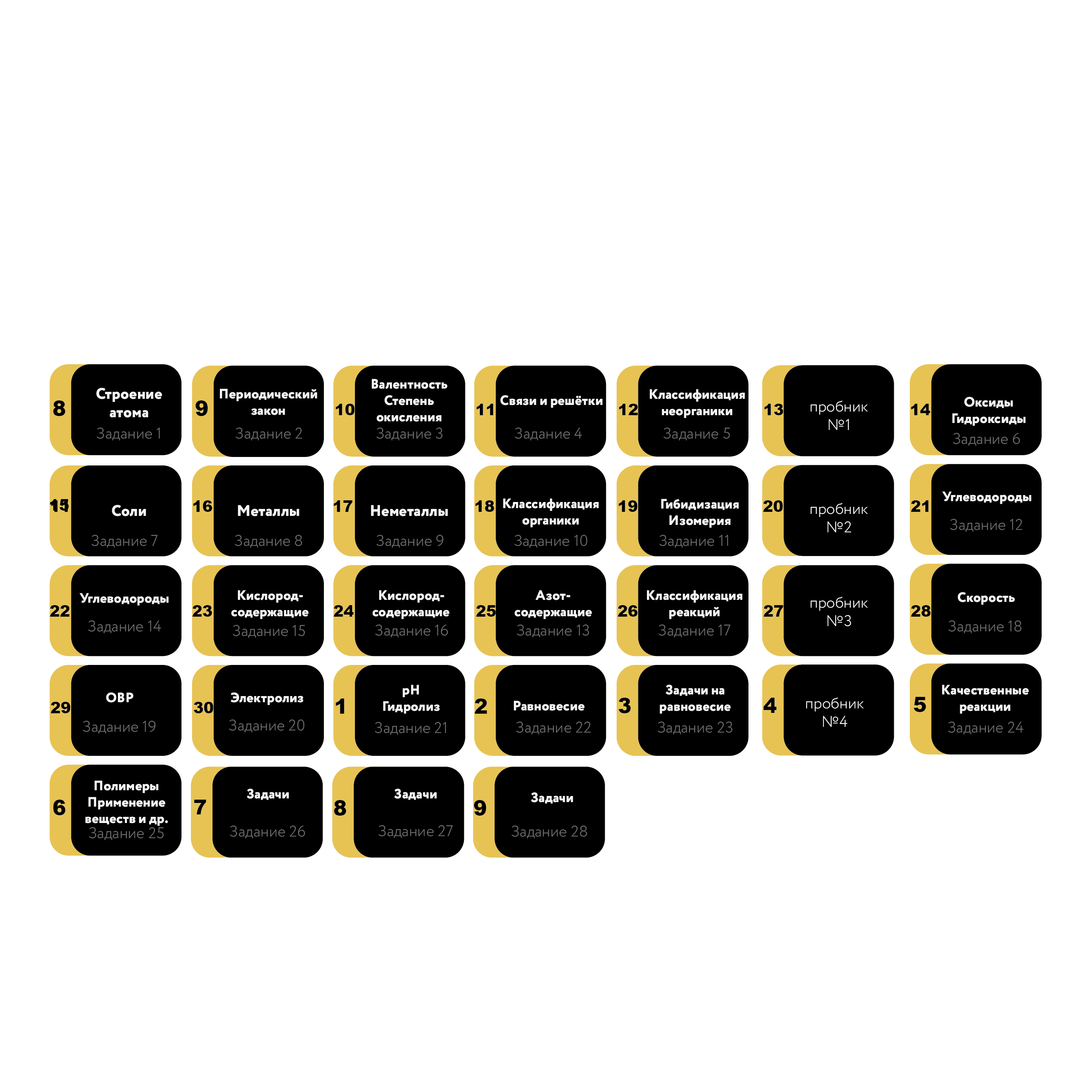 Я записалась на финальный курс химтим-марафон пробников. Именно этот формат лучше всего подойдёт тем, кто готовился весь год и хочет повторить всю химию на практике, порешать очень интересные варианты, специально составленные из необычных и сложных вопросов, и закрыть все пробелы перед экзаменом. Время для марафона было выбрано очень удачно, поэтому практически каждый день я успевала прийти на разбор онлайн, а потом хватало сил и на домашнее задание. В общем, последние 2 недели перед экзаменом прошли максимально интенсивно и полезно!